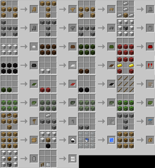 Вам наверное как и мне, часто не хватало в игре некоторых привычных и повседневных вещей быта. Как например стулья со столом или дивана, холодильника и шкафчиков, жалюзи и штор, газовой плиты с вытяжкой, или просто такие предметы интерьера как фонтаны и скворечники. Все это и многое другое вы сможете получить обычным крафтом после установки данного мода, под названием MrCrayfish’s Furniture. | |